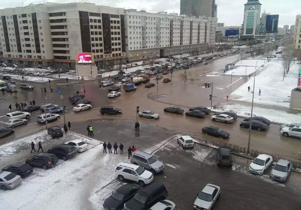 Авария произошла на левом берегу на пересечении улиц Сауран-Сыганак. Буквально за несколько минут вода затопила проезжую часть и затруднила движение на улице.