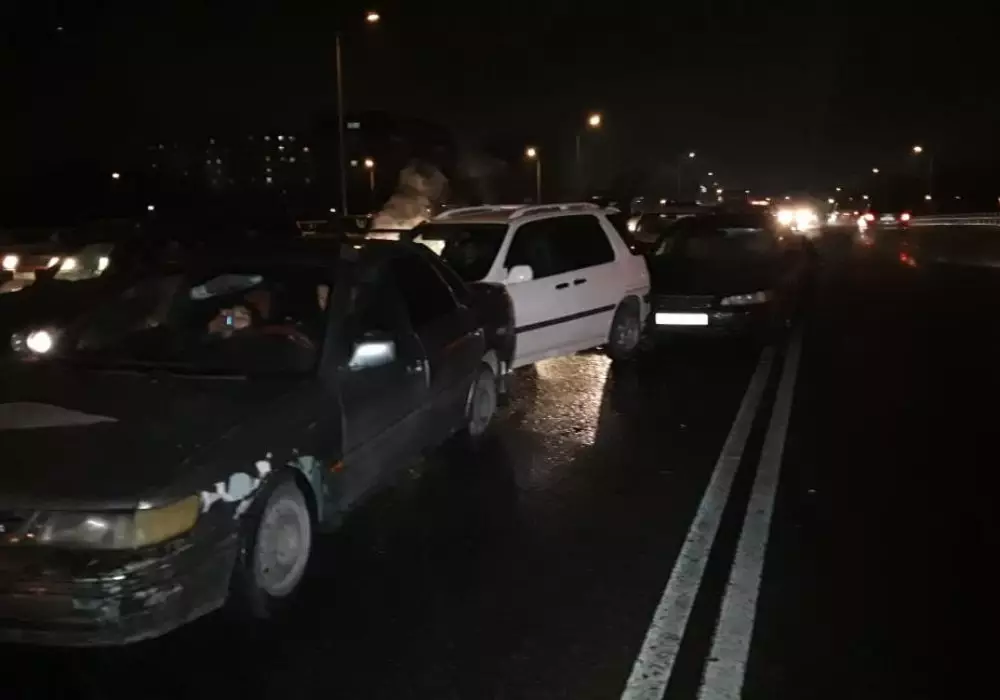 Авария произошла на развязке на пересечении улицы Саина и проспекта Райымбека. По словам очевидцев, водитель Renault двигался по Райымбека в западном направлении и допустил столкновение с Mitsubishi, затем еще с тремя автомобилями, которые остановились перед затором.