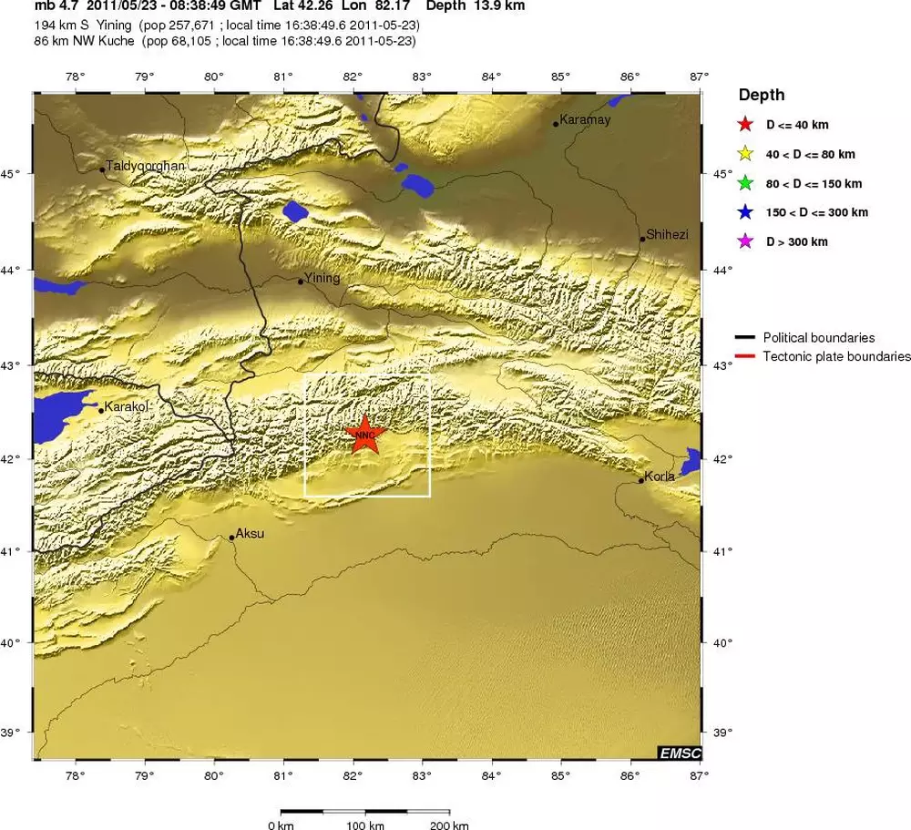 В 14.38 по времени Астаны на территории Китая неподалеку от восточной границы с Казахстаном произошло землетрясение магнитудой 4,7. Об этом сообщает Tengrinews.kz со ссылкой на сайт Европейского сейсмологического центра (European-Mediterranean Seismological Centre). По информации казахстанского центра сейсмических данных института геофизических исследований Национального ядерного центра, эпицентр землетрясения находился в 440 километрах восточнее Алматы на глубине 14 километров. Напомним, что предыдущее землетрясение магнитудой 5,2 в Китае на границе с Казахстаном произошло 22 мая в 16.52 по времени Астаны.