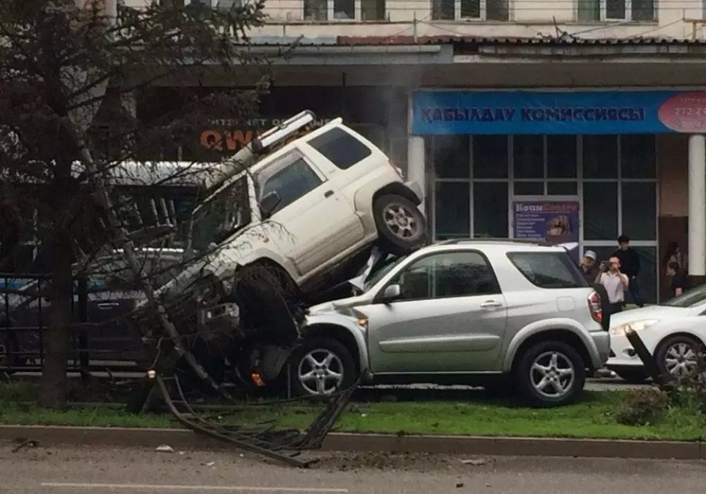 Последствия аварии на пересечении проспекта Абая с улицей Фурманова засняли очевидцы. Одна автомашина оказалась на другой, проломив железное ограждение.