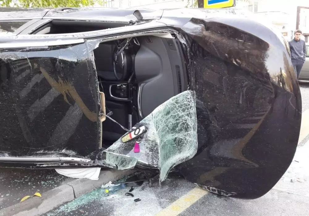 Nissan Qashqai перевернулся от удара Volkswagen Golf на перекрестке в Алматы, передает корреспондент программы "Территория происшествий" на телеканале СТВ.