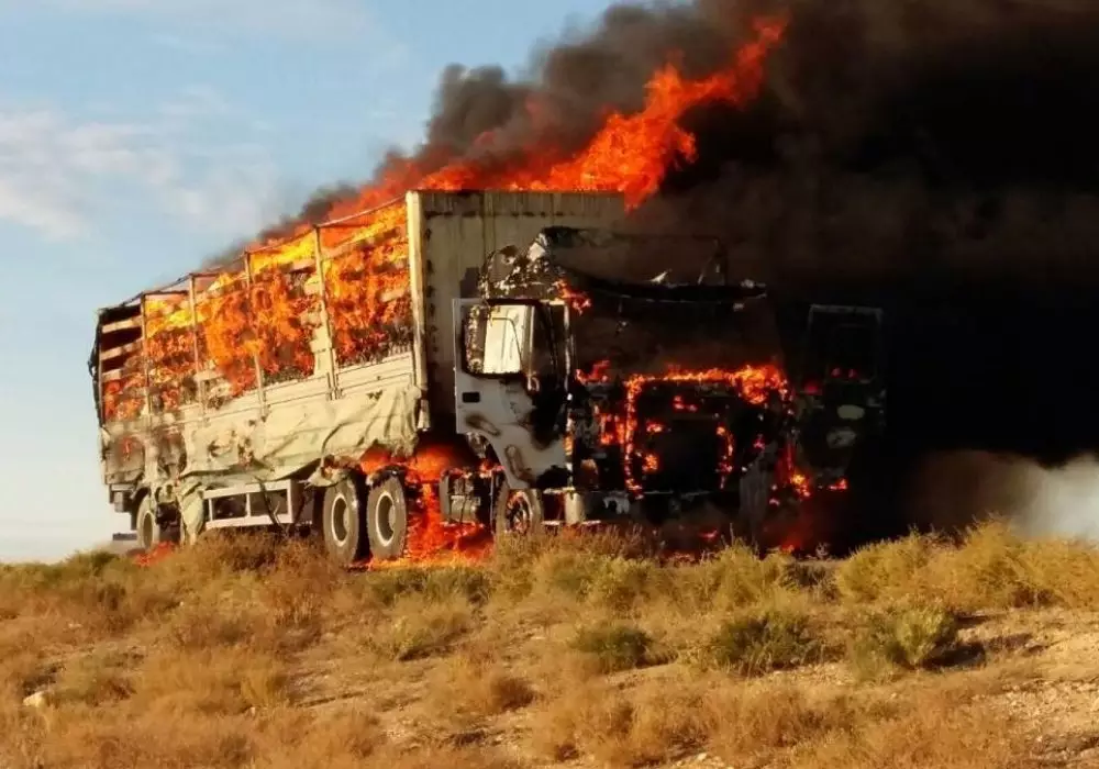 Грузовая фура дотла сгорела на трассе Актау - Форт-Шевченко, сообщает портал "Лада". По предварительным данным, возгорание началось в 8.40.