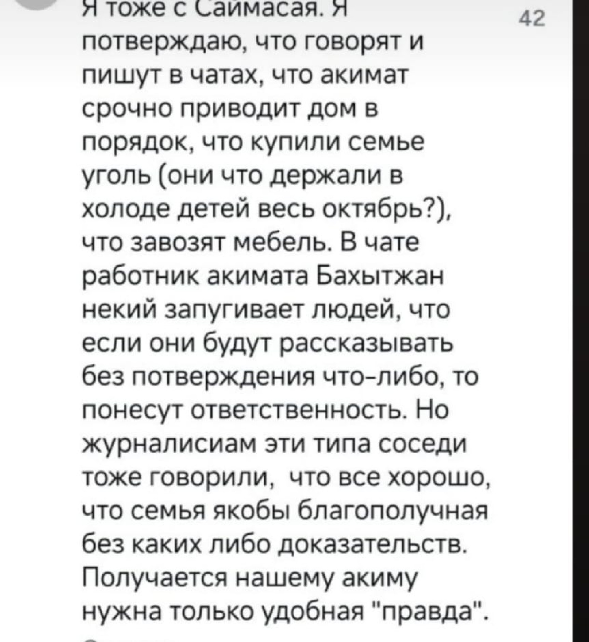"После того как ребёнок погиб, акимат в дом пригласил клининг, там им убрались, велосипед привезли какой-то, уголь. Сделали вид, как будто в этом доме все нормально было, но на самом деле не было. Дети грязные и голодные ходили. Школу часто прогуливали. Учителя говорят, что такого не было. Это неправда", - говорят жители села.