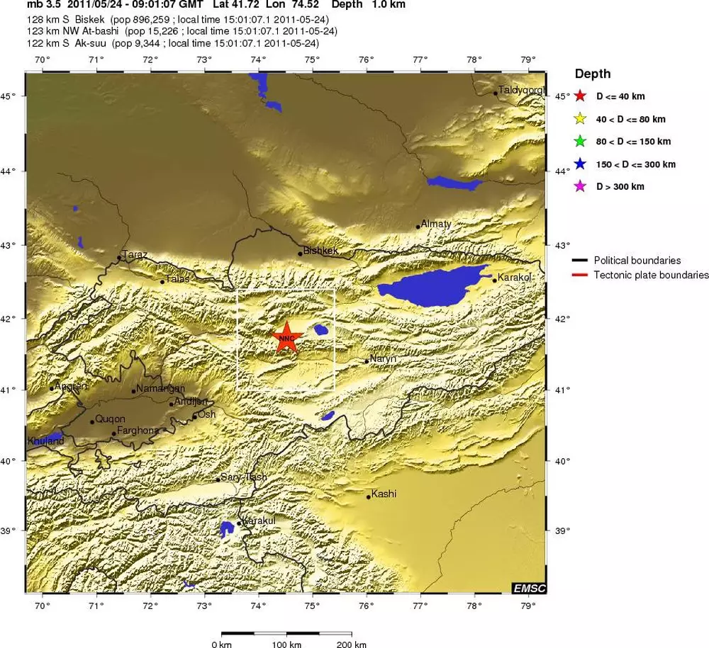 В Кыргызстане в 15.01 по местному времени произошло землетрясение магнитудой 3,5, сообщает Tengrinews.kz со ссылкой на сайт Европейского сейсмологического центра (European-Mediterranean Seismological Centre).