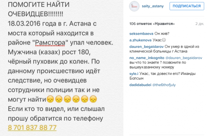 В пресс-службе полиции сообщили о том, что 18 марта около 22 часов в ЦОУ ДВД Астаны поступило сообщение о том, что мужчина прыгнул с моста возле ТД "Рамстор" по улице Бараева.