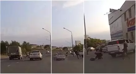 Сбитая Daewoo Nexia девушка в Актау перевернулась в воздухе от удара Кадры из видеоролика ladakz/YouTube