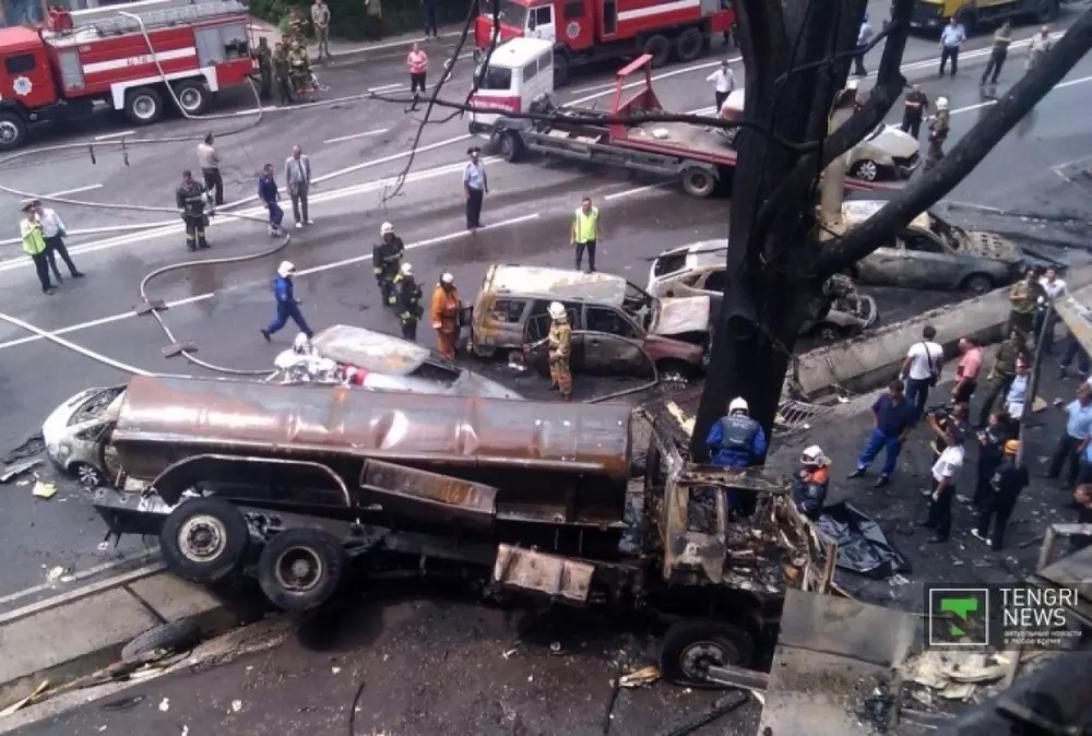 Напомним, бензовоз взорвался утром 27 июня. "Водитель (1986 года рождения) ТОО "Гелиос", управляя автомашиной FAW JH 120GJY (топливозаправщик-цистерна), следуя по Сейфуллина в северном направлении, выехал на встречную полосу и допустил столкновение с автомашиной Mitsubishi Pajero. В результате, по инерции Mitsubishi отбросило на автомобиль Lexus RX 300. Топливозаправщик, следуя по встречной полосе, допустил столкновение с автомашиной ГАЗ-3302114", - сообщили в ДВД Алматы.