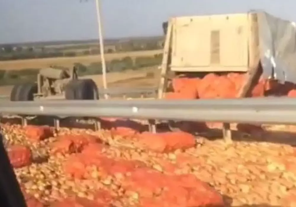 На кадрах видно, что мешки с луком разбросало по всей трассе. Многие из мешков порвались и содержимое вывалилось наружу.