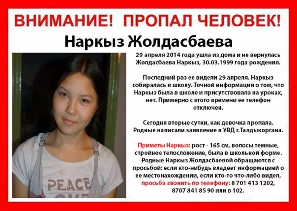 15-летние Наркыз Жолдасбаева и Айдана Кожебаева ушли из дома 29 апреля 2014 года. Девочки учатся в одной школе, после уроков они ушли вместе и с тех пор их не видели. Сотовые телефоны у них отключены.