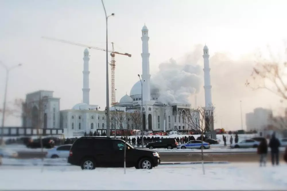 Сообщение о пожаре в строящейся в Астане мечети "Хазрет Султан" поступило в 15 часов 15 минут 15 января. Как сообщает МЧС, в здании мечети на уровне третьего этажа произошло возгорание строительных лесов и внутреннего отделочного материала "Барисол". Пожар, площадь которого достигла 800 квадратных метров, был ликвидирован в 17 часов 49 минут. В тушении были задействованы: 171 человек личного состава и 39 единиц техники службы пожаротушения ДЧС Астаны, 6 человек личного состава и 1 единица техники ГУ "ЦРАОСО" МЧС РК, 3 человека и 1 единица техники ГУ "ЦМК" МЧС РК. В ходе тушения в 17 часов 15 минут был обнаружен труп. Были спасены 13 человек.
