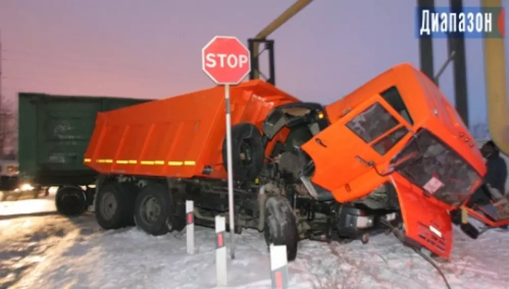 Водитель автомашины потерял рулевое управление на скользкой дороге перед железнодорожным переездом в тот момент, когда по ветке двигался состав. КамАЗ пошел юзом. Столкновение случилось перед самыми воротами предприятия ТОО "Стройдеталь".