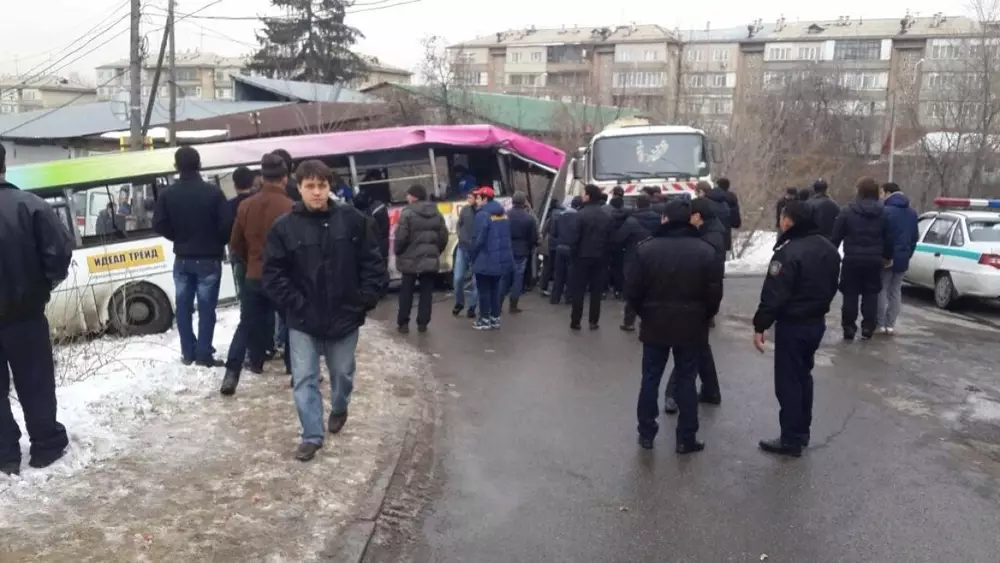Автобус №31 с пассажирами, спускаясь в северном направлении (вниз) в микрорайоне "Казахфильм", по улице Исиналиева, снес порядка десяти легковых автомобилей. После чего на повороте он столкнулся с бетономешалкой. Однако, по другой информации, автобус столкнулся с мусоровозом.