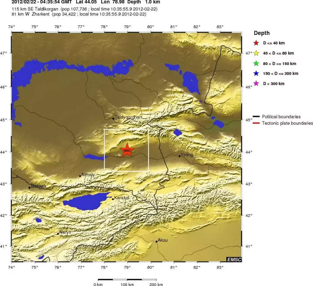 22 февраля в Казахстане произошло землетрясение магнитудой 3,3, передает корреспондент Tengrinews.kz со ссылкой на данные сайта Европейско-Средиземноморского сейсмологического центра. Подземные толчки были зафиксированы в 10.35 по времени Астаны. Эпицентр землетрясения находился в 115 километрах к юго-востоку от Талдыкоргана и в 81-м километре к западу от Жаркента. Сведений о жертвах и разрушениях нет. Напомним, 20 февраля 2012 года в Кыргызстане произошло землетрясение магнитудой 5. Эпицентр землетрясения находился в 111 километрах к северо-востоку от узбекистанского Андижана и в 34 километрах к юго-востоку от Токтогула (Кыргызстан).