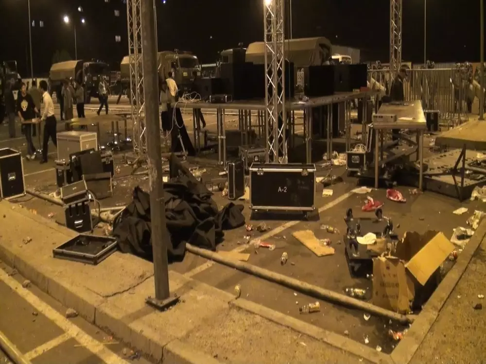 Данияр Батырбаев во время прямой трансляции Tengrinews TV рассказал: "Когда объявили, что на сцену выходит супермегазвезда Кайрат Нуртас, был прорван один кордон, второй, третий, и народ стал подходить ближе и ближе к сцене, прорвав полностью оцепление. И когда уже (зрители) начали выходить на сцену, служба безопасности просто забрала артиста и увела". Сразу после этого беспорядки усилились. "Потом полетели вначале пластиковые бутылки, потом одна, вторая - стеклянные. Мы с Аэлитой Хабибуллиной, соведущей вечера, залезли под сцену, где и подождали, пока ОМОН начал разгонять народ", - рассказал шоумен.