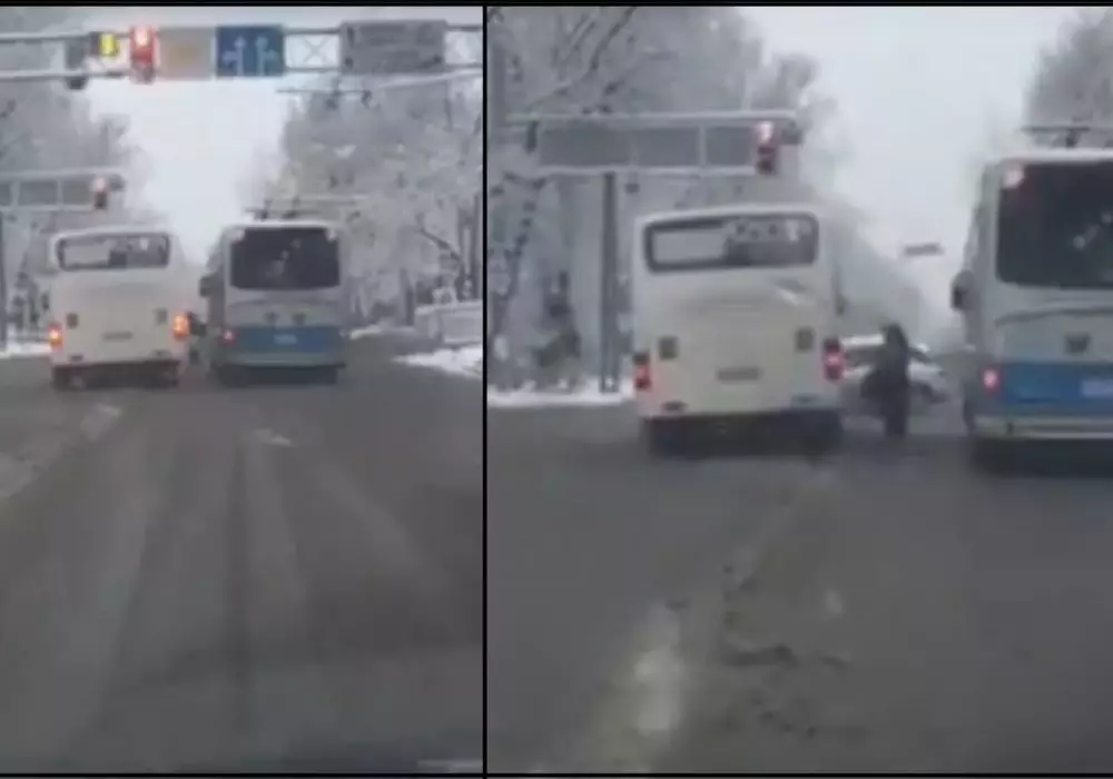 10 декабря на странице instavideo_kaz в Instagram появилось видео, на котором запечатлен рейсовый автобус, который, подъезжая к перекрестку, выехал на встречную полосу улицы. Видимо, водитель решил быстро объехать по "встречке" следовавший впереди троллейбус. Не дождавшись зеленого света светофора, автобус начал переезжать перекресток, при этом едва не сбив женщину с ребенком, которые в это время переходили улицу.