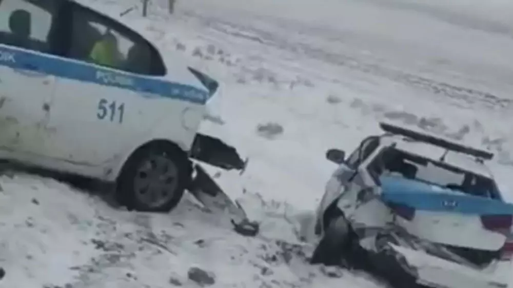 "В это время житель Шымкента, водитель BMW, направлявшийся из мегаполиса в Туркестан, из-за гололедицы не справился с рулевым управлением и протаранил две служебные автомашины патрульной полиции Kia Rio, припаркованные у дороги", - сообщили в полиции.