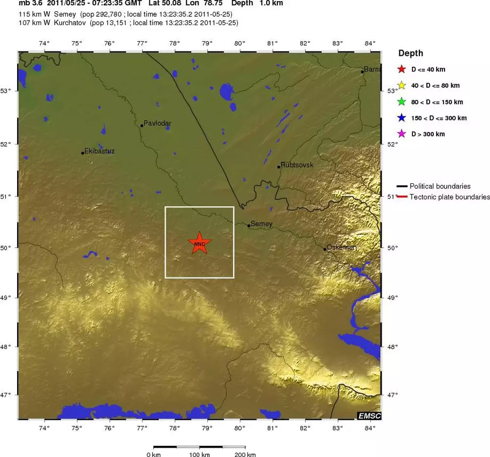По данным EMSC, эпицентр подземных толчков находился в 115 километрах к западу от Семея. Очаг залегал на глубине одного километра.