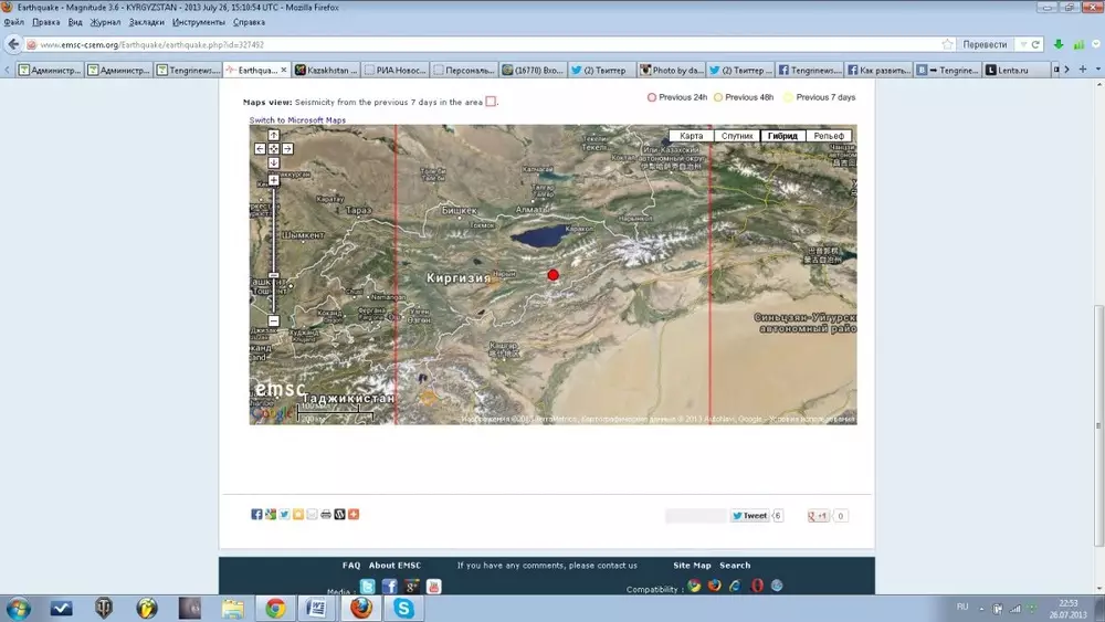 В Кыргызстане 26 июля в 21.10 по времени Астаны произошло землетрясение магнитудой 3,6, передает корреспондент Tengrinews.kz со ссылкой на Европейско-Средиземноморский сейсмологический центр. Очаг подземных толчков зафиксирован на глубине одного километра. Эпицентр землетрясения располагался в 286 километрах к юго-востоку от столицы республики Бишкека, в 128 километрах к юго-западу от Караколя, в 98 километрах к юго-западу от села Кызыл-Суу и в 75 километрах к юго-востоку от села Каджи-Сай. Информации о жертвах и разрушениях нет.