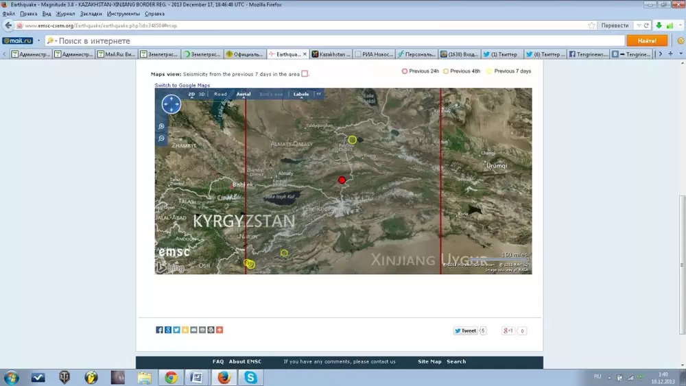 Землетрясение зафиксировано 18 декабря в 00.46 по времени Астаны возле казахстанско-китайской границы. Очаг подземных толчков зафиксирован на глубине одного километра. Эпицентр землетрясения располагался в 273 километрах к востоку от Алматы, в 169 километрах к северо-востоку от города Караколь (Кыргызстан) и в 88 километрах к востоку от населенного пункта Кеген (Казахстан).