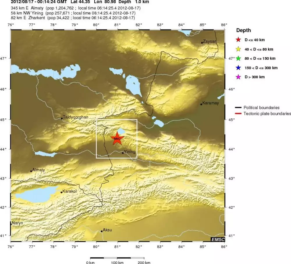 На границе Казахстана и Китая произошло землетрясение магнитудой 3,8, передает Tengrinews.kz со ссылкой на Европейско-Средиземноморский сейсмологический центр. Подземные толчки были зарегистрированы 17 августа в 6.14 по времени Астаны. Эпицентр землетрясения находился 345 километрах к востоку от Алматы, в 82 километрах к востоку от Жаркента, в 58 километрах к северо-западу от китайского города Инин. О жертвах и пострадавших не сообщается.