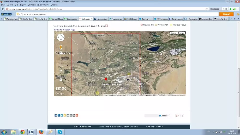 Землетрясение магнитудой 4,3 произошло на территории Таджикистана 19 января в 21.48 по времени Астаны, передает корреспондент Tengrinews.kz со ссылкой на Европейско-Средиземноморский сейсмологический центр. Очаг подземных толчков зафиксирован на глубине семи километров. Эпицентр землетрясения располагался в 139 километрах к северо-востоку от столицы республики города Душанбе, в 111 километрах к северу от Муминобода и в 11 километрах к северо-востоку от Навобода. Информации о жертвах и разрушениях нет. Напомним, 10-11 января в Таджикистане была зафиксирована серия подземных толчков магнитудой до 5,0. Землетрясение полностью разрушило 104 дома, еще 256 строений пострадали. Эпицентр подземных толчков находился на территории района Рудаки, в 21-26 километрах юго-восточнее Душанбе. На территории Казахстана последнее землетрясение произошло 16 января. Эпицентр располагался на востоке республики, в 227 километрах к востоку от Алматы.