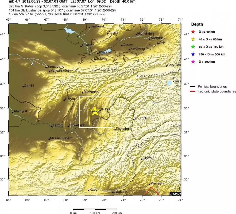 Подземные толчки были зафиксированы 29 июня в 08.07 по времени Астаны в 373 километрах севернее Кабула и в 100 километрах юго-восточнее Душанбе. Эпицентр находился на глубине 40 километров. Информации о пострадавших и разрушениях не поступало.