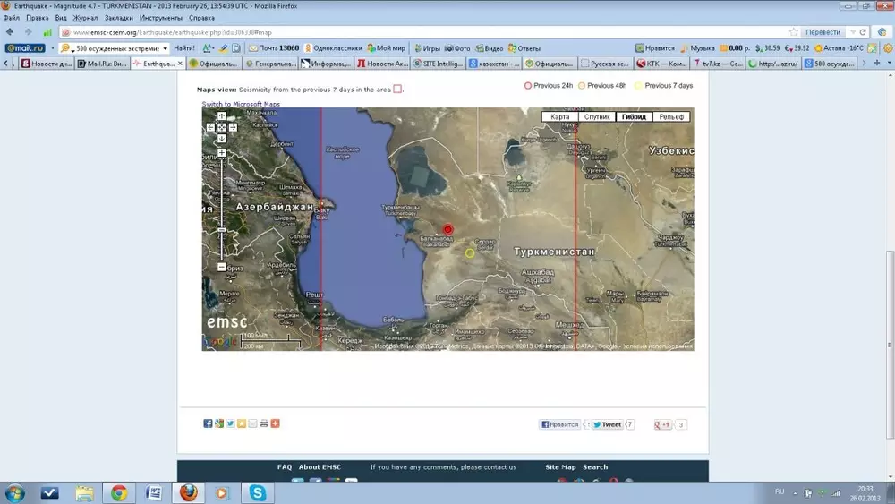 На территории Туркменистана произошло землетрясение магнитудой 4,7, передает корреспондент Tengrinews.kz со ссылкой на Европейско-Средиземноморский сейсмологический центр. Очаг землетрясения зафиксирован на глубине десять километров. Эпицентр подземных толчков находился в 431 километре к востоку от столицы Азербайджана Баку, в 270 километрах к северо-западу от города Гомбеде-Кавус (Иран) и 44 километрах к северо-востоку от Балканабада (Туркменистан). Информации о жертвах и разрушениях нет. Не исключено, что незначительные подземные колебания могли ощущать жители населенных пунктов на юго-западе Казахстана.