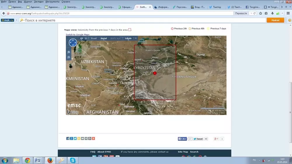Землетрясение магнитудой 5,4 произошло в 302 километрах от Алматы Карта с указанием эпицентра землетрясения с сайта emsc-csem.org