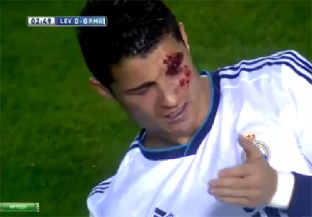 Один из лучших футболистов планеты получил травму на третьей минуте во время игрового столкновения с защитником "Леванте" Давидом Наварро. В борьбе за мяч соперник угодил Роналду локтем в глаз и рассек ему бровь.