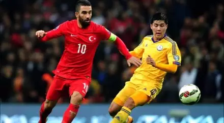 Сборная Казахстана по футболу проиграла Турции в отборе на Евро-2016 Арда Туран и Бауыржан Исламхан. © kaztv.kaztrk.kz