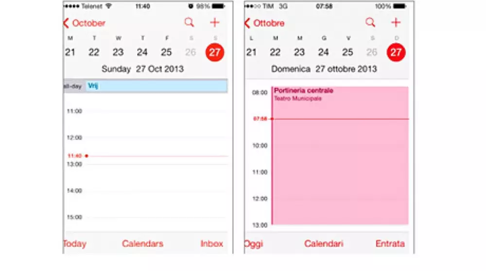 Пользователи из стран, где осуществляется переход с летнего времени на зимнее, пожаловались, что после перевода часов в устройствах на iOS 7 у них возникла ошибка в приложении "Календарь". Суть ошибки состоит в том, что в "Календаре" красная линия, обозначающая текущее время, находится на неправильной позиции - она сдвинута на час вперед. Например, в 12.15 линия находится на отметке 13.15.