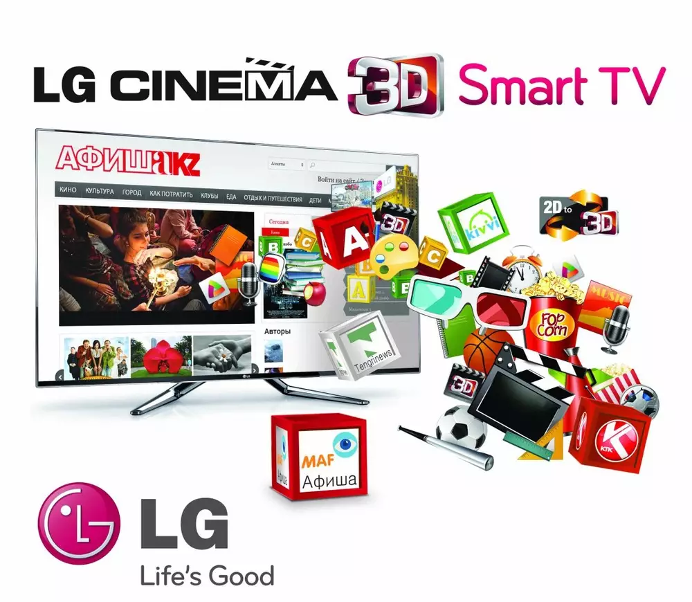 Компания LG Electronics (LG) представляет очередное приложение на телевизорах LG Cinema 3D Smart TV: MAF - афиша холдинга "Меломан". Это четвертое по счету локальное приложение для телевизоров LG наряду с запущенными ранее приложениями КТК, KIWI.kz и Tengrinews.kz. МAF - это афиша кинотеатров, клубов, театров и других развлекательных и культурных событий Казахстана. В разделе "премьеры" собрана информация о фильмах, которые выйдут в течение года. В приложении есть адреса и телефоны кинотеатров, клубов, театров, концертов, выставок и презентаций. Приложение MAF также доступно для устройств под управлением Android OS (beta-версия). Адрес сайта мобильной афиши - maf.kz. Tengrinews.kz - это актуальные и самые свежие казахстанские и мировые новости экономики, культуры, социальной жизни, интервью, а также новости спорта, включая оперативно обновляемую информацию о летней Олимпиаде в Лондоне. Ранее запущенное приложение KIWI.kz открывает доступ к огромному количеству аудио- и видеоматериалов казахстанского популярного медиапортала, включая онлайн-видеотрансляции. Помимо просмотра и прослушивания медиаконтента приложение позволяет осуществлять поиск по жанрам, оценивать и оставлять комментарии. Приложение популярного телеканала КТК представляет самые актуальные новости и события в Казахстане, а также предлагает новостное онлайн-вещание и доступ к полному архиву всех новостных выпусков. Магазин приложений LG Apps TV в Smart-телевизорах LG предлагает пользователям более 380 приложений в категориях игры, информационно-новостные, образовательные, развлекательные, полезные, разработанных специально для телевизоров LG. Помимо прочего, в LG Smart TV доступны сервисы социальных сетей в новом интерфейсе: теперь пользователь может проверять ленту новостей в таких сервисах, как Facebook, Twitter и другие, не отрываясь от просмотра эфирных, кабельных или спутниковых каналов. Также в текущем году компания LG представила инновационный пульт дистанционного управления Magic Remote для телевизоров LG CINEMA 3D Smart TV, который впервые был продемонстрирован на выставке CES-2012 (Customer Electronics Show ) в Лас-Вегасе. Благодаря набору дополнительных функций, таких как распознавание голоса, колесо прокрутки и распознавание жестов, новый пульт обеспечивает максимум удобства пользователям.