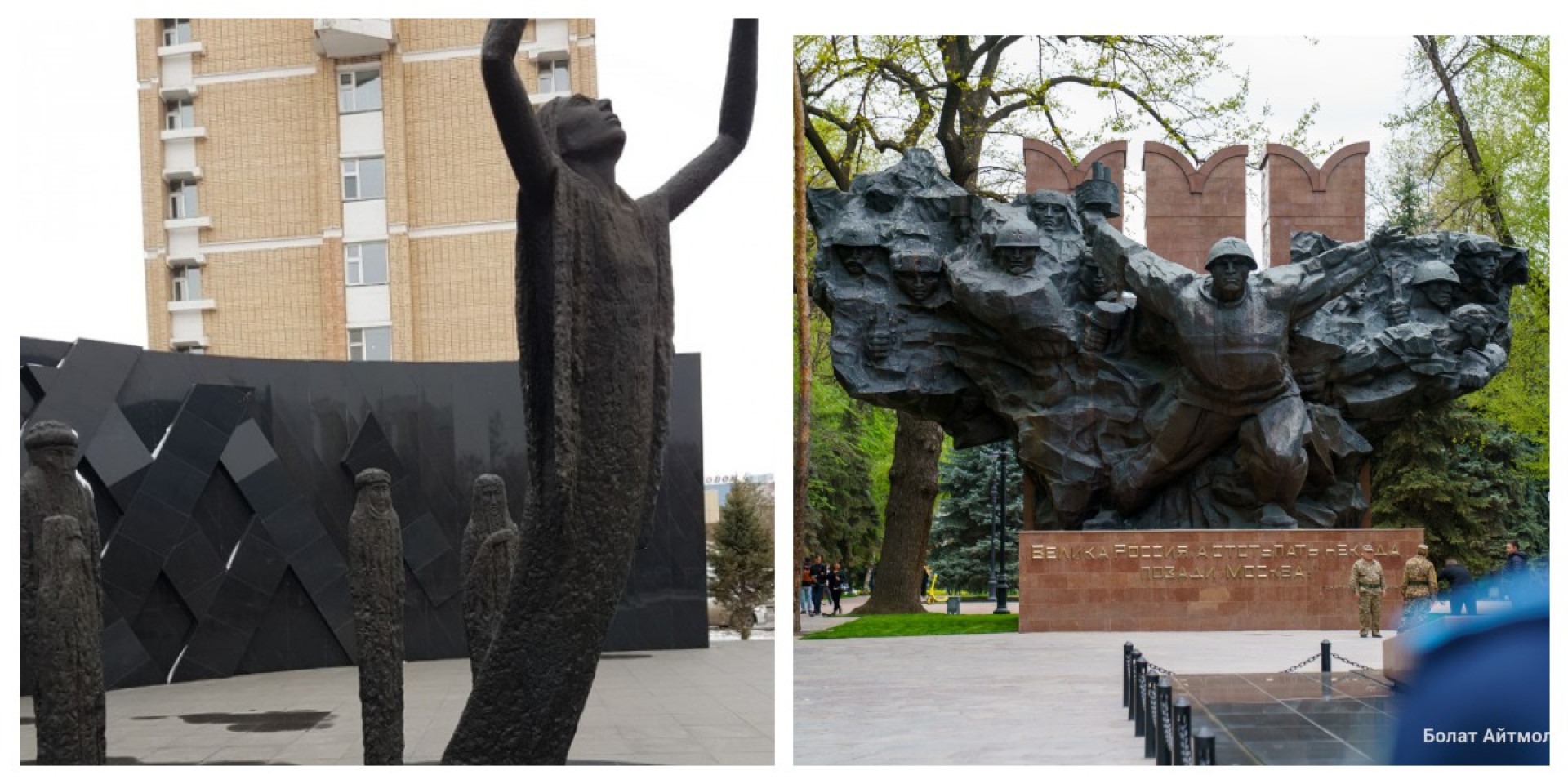 Слева - памятник жертвам голодомора 1932-1933 гг., Астана, авторы: Валерий Пирожков и Орал Алибаев. Справа - памятник генералу И. Панфилову и 28 героям-панфиловцам, Алматы, скульптор - Ренат Абенов. Фото ©️ Tengrinews.kz