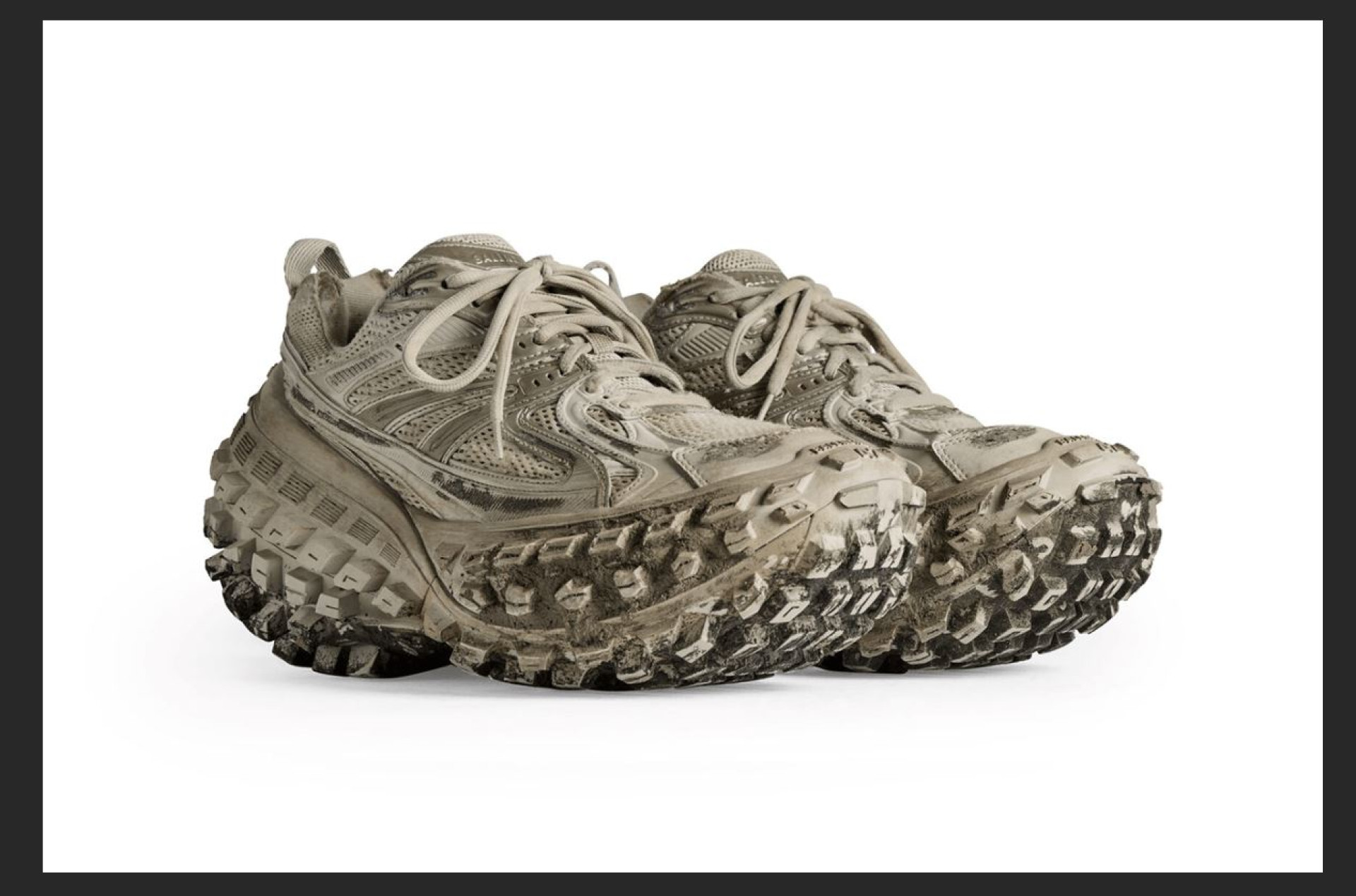 Моду на "поношенность" подхватили и другие крупные бренды. Balenciaga несколько лет назад запустила модели Muddy 3XL и Defender — массивные кроссовки, нарочно покрытые "грязью".