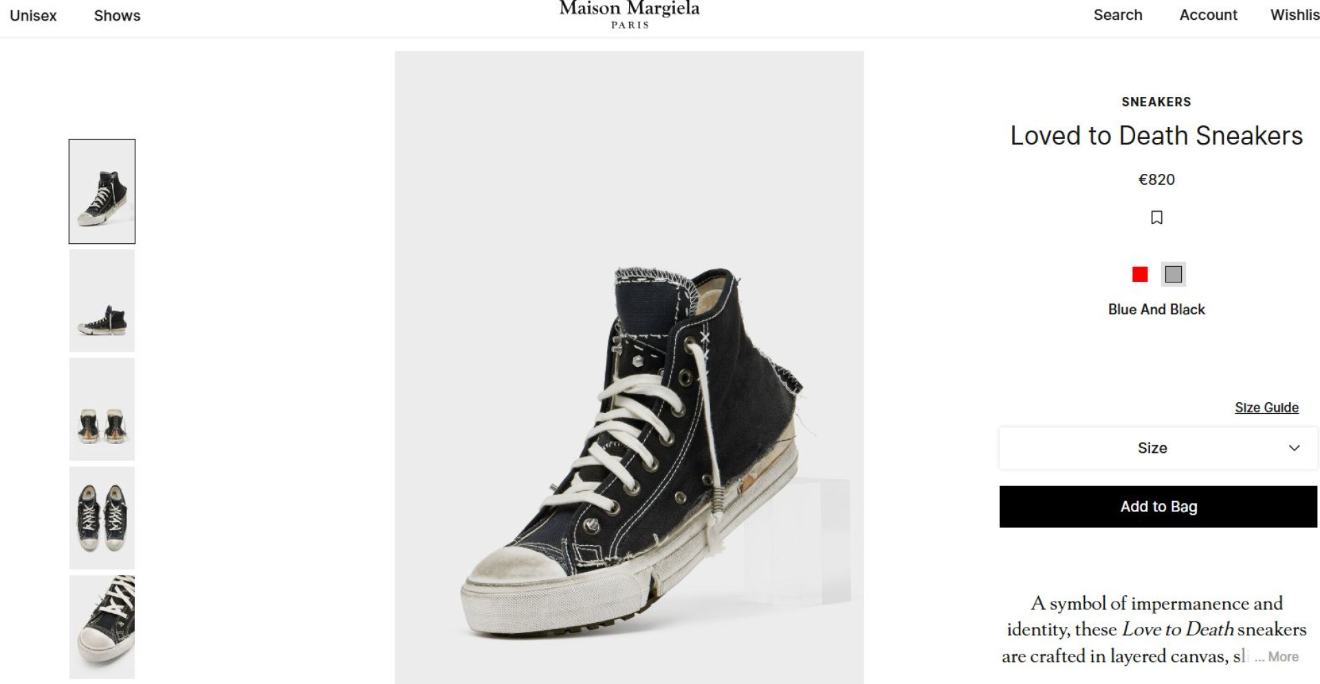 Maison Margiela недавно представил кеды Loved to Death ("Возлюбленные до смерти"), созданные к Хеллоуину. Они были вручную состарены дизайнерами. Стоят они около тысячи долларов и, по задумке создателей, должны выглядеть так, будто их уже носили не один год.