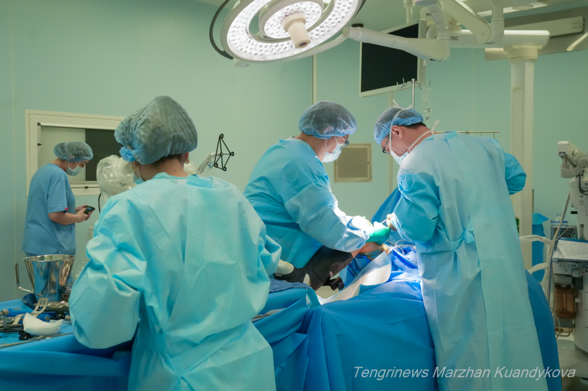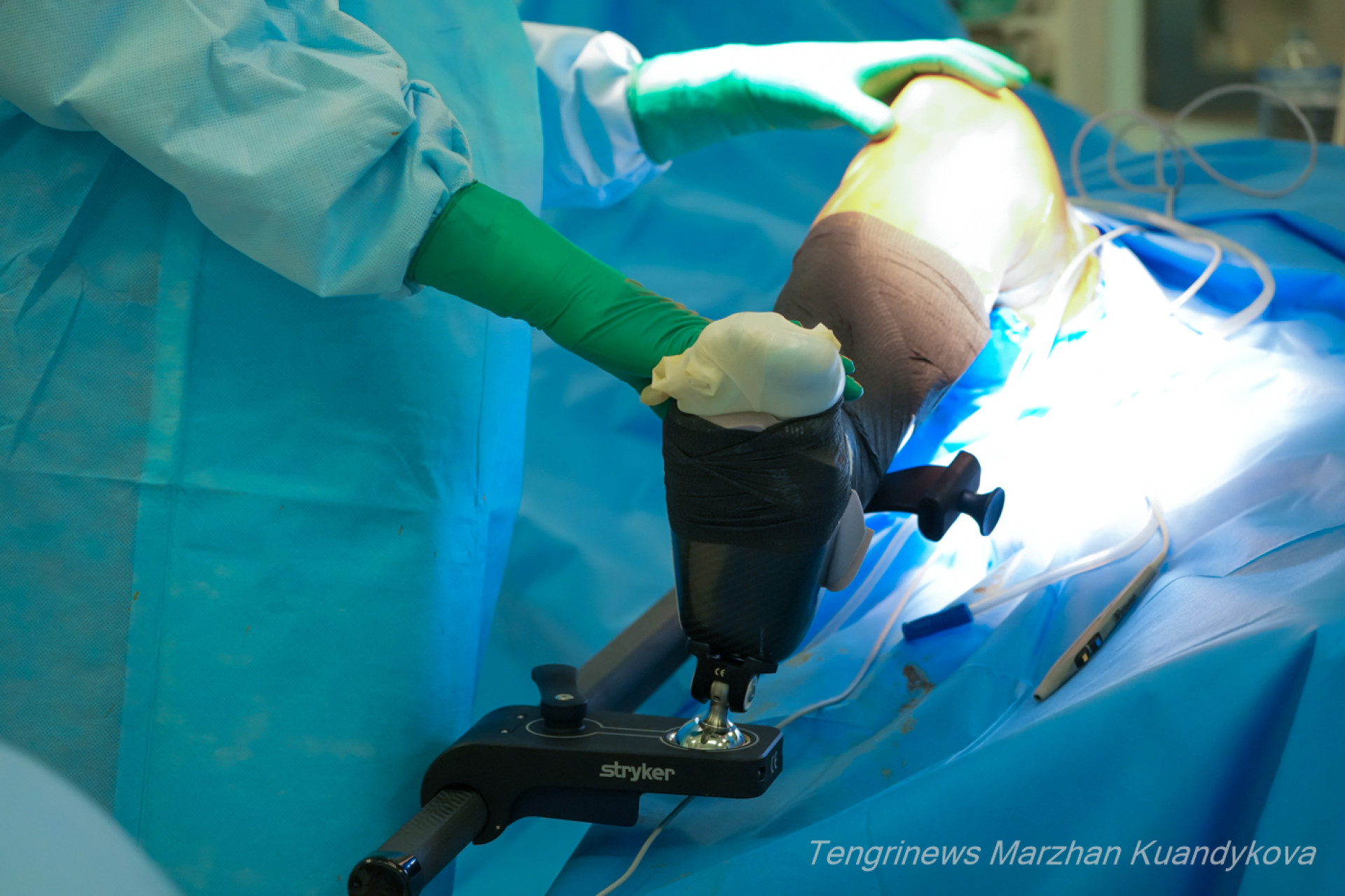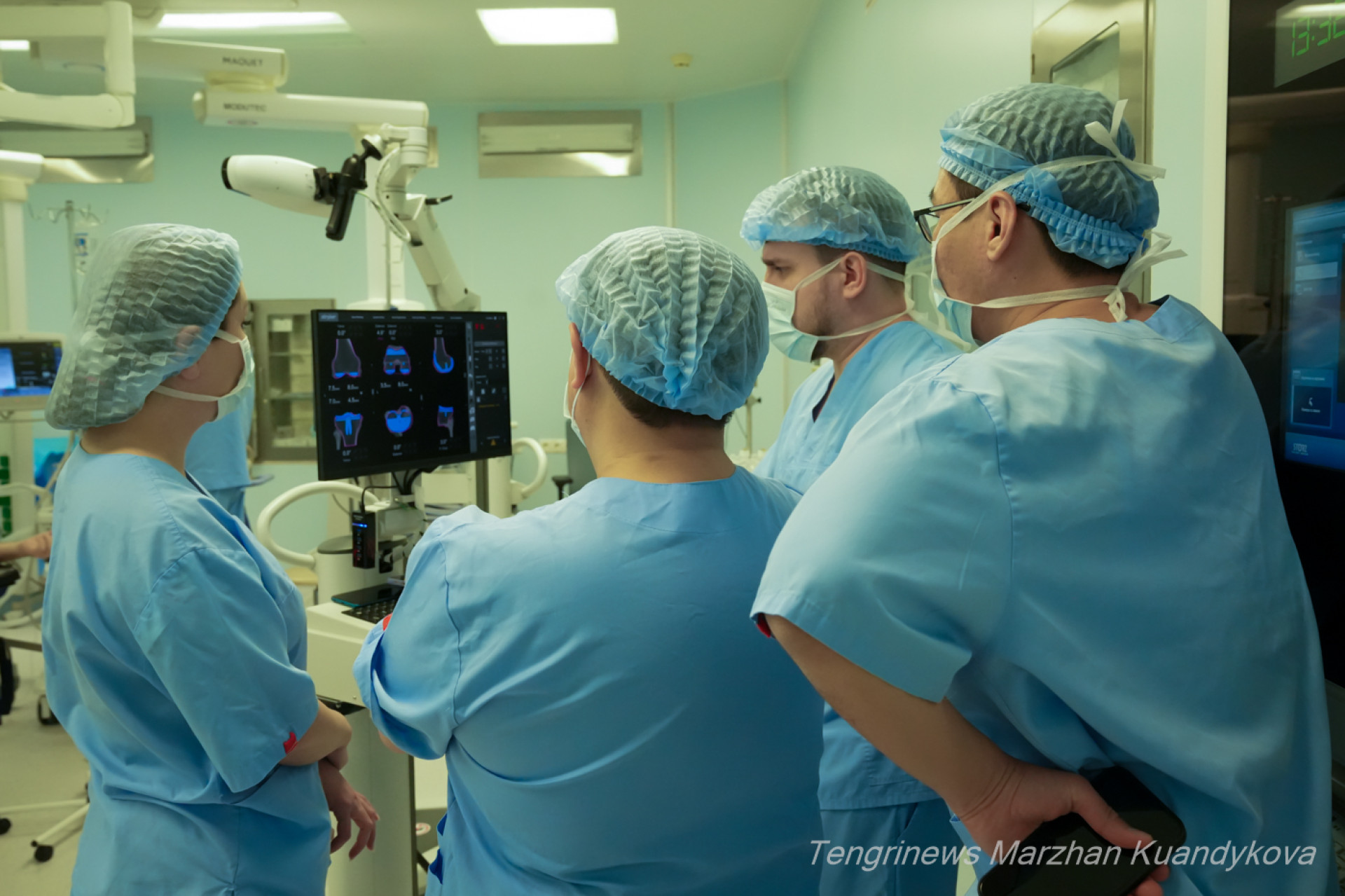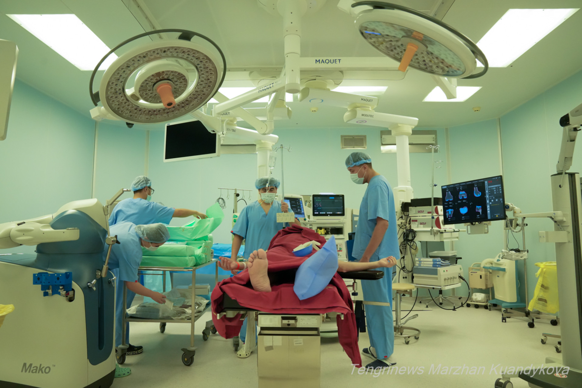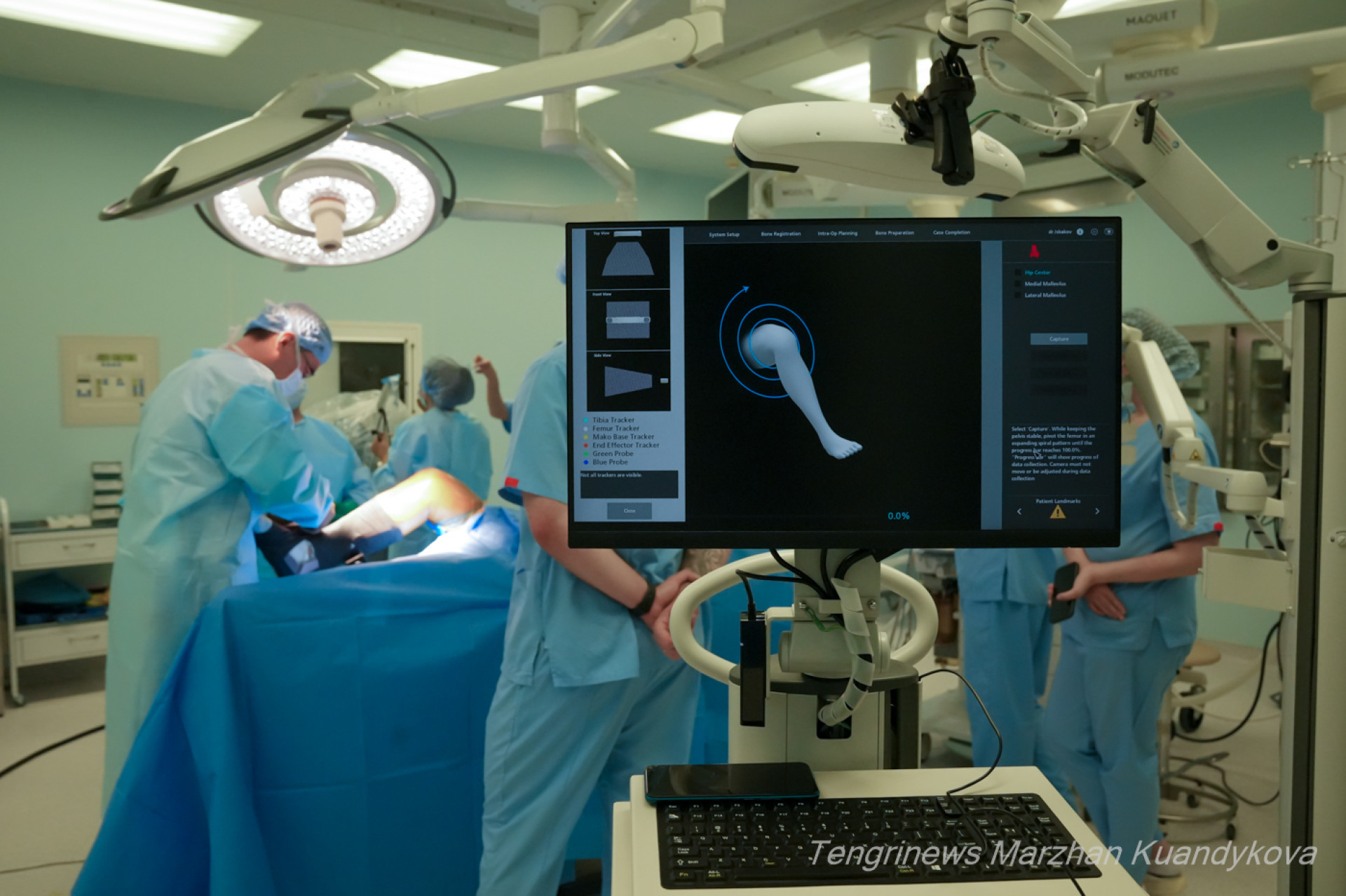 Начинается операция. Над столом склоняются хирург Булат Искаков, травматолог-ортопед Мухитдин Джума-Ахунов и медсестра. У специального экрана — инженер системы Mako. Эта роботизированная система, одна из самых передовых технологий в мировой травматологии и ортопедии.