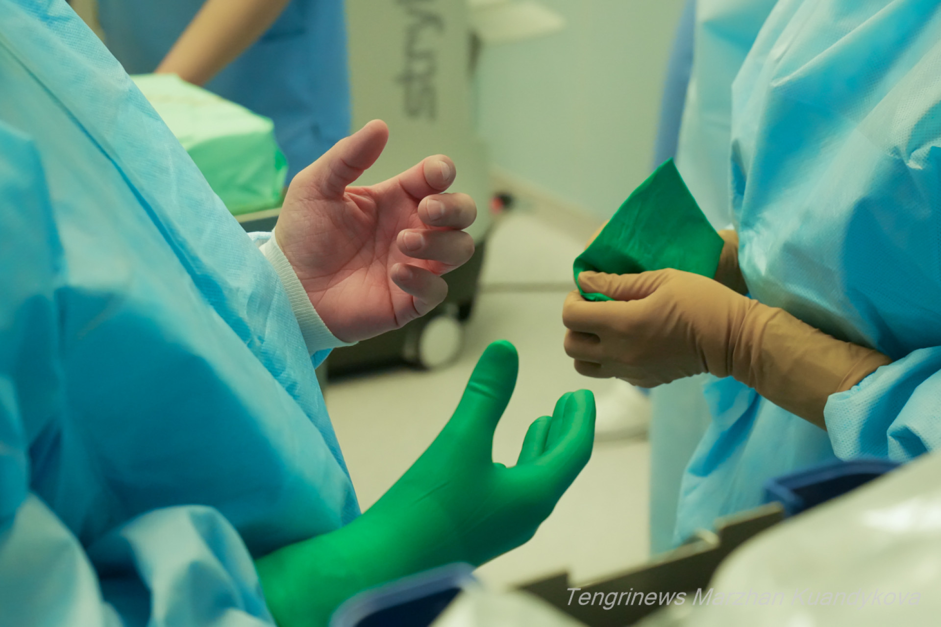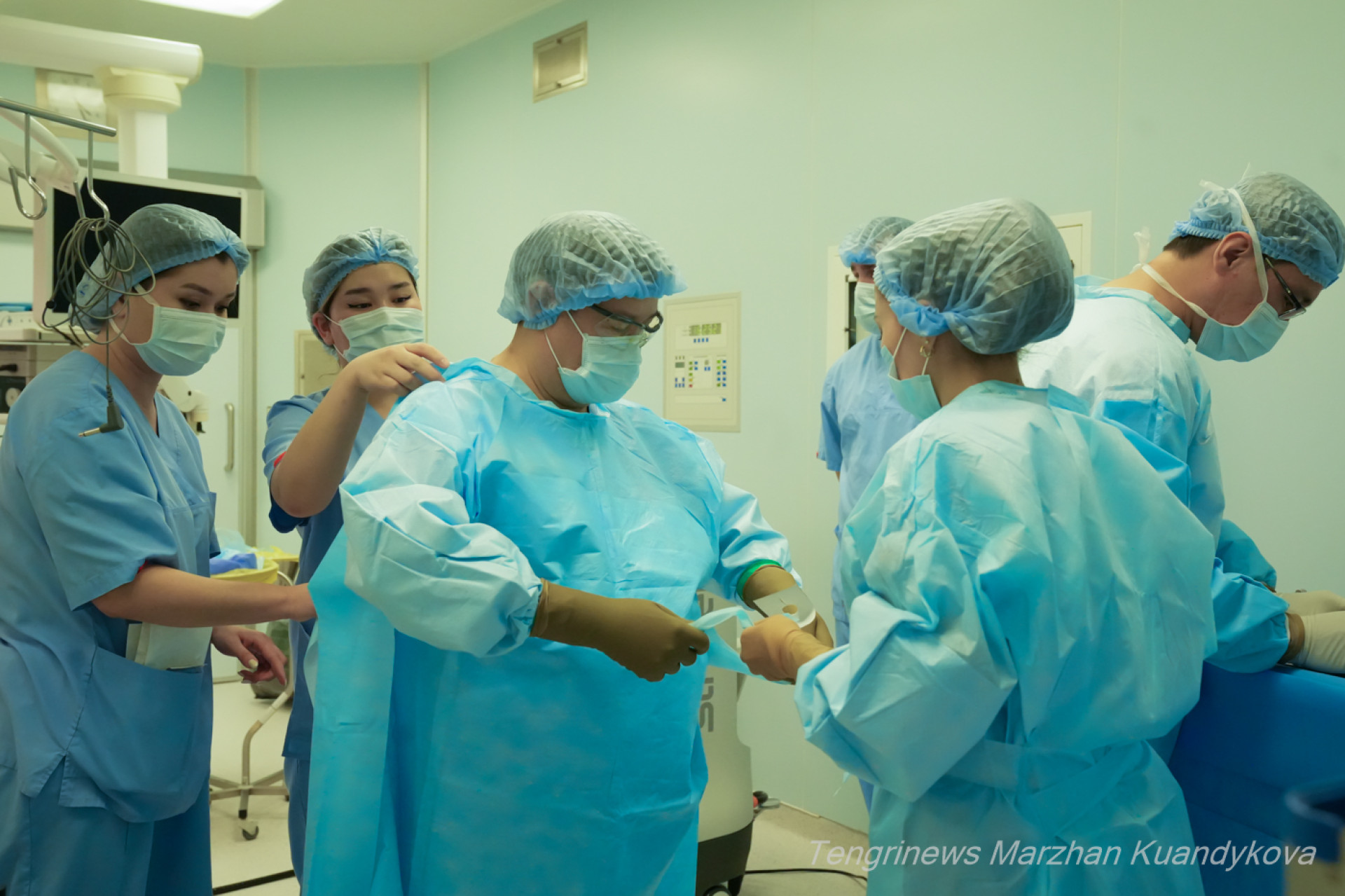 Команда готовится к операции: дезинфицируют руки, ассистенты помогают надеть стерильные перчатки, анестезиолог проверяет оборудование.