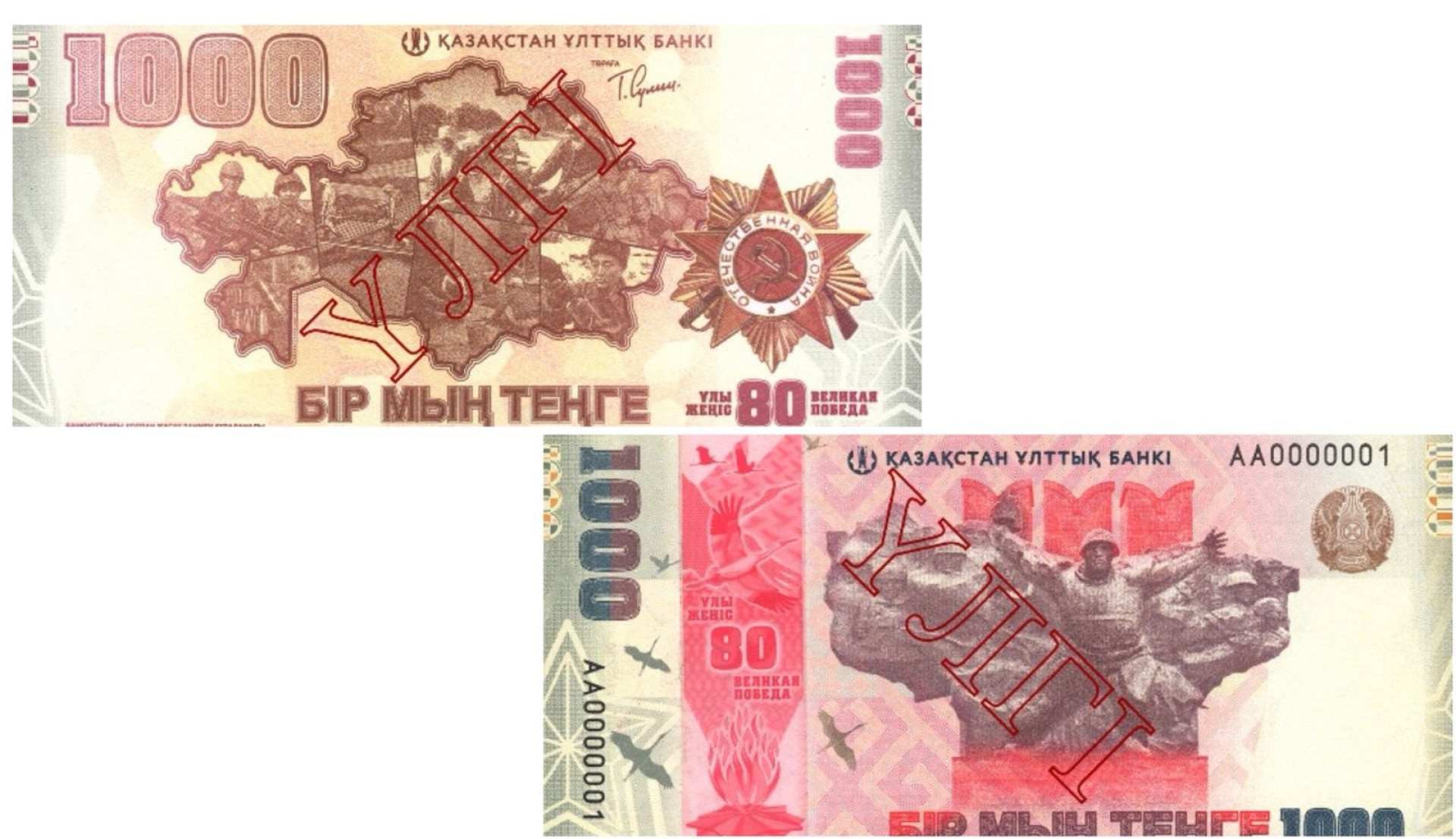 - Юбилейная банкнота 1000 тенге, посвящённая 80-летию Победы.
