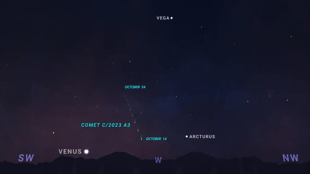 "27 сентября комета С/2023 А3 Цзыцзиньшань-ATLAS прошла перигелий, приблизилась к Солнцу на расстояние 0,39 астрономических единиц (около 58 миллионов километров). 12 октября она будет находиться ближе всего к нашей планете на расстоянии 0,48 астрономических единиц (около 70 миллионов километров). По мере удаления кометы от Земли яркость ее будет быстро уменьшаться. Примерно с 11 по 12 октября появится над горизонтом в северном полушарии после захода Солнца, приблизительное время для визуальных наблюдений - с 12-го по 18 октября, далее комету можно будет увидеть только в телескоп", - сообщила она.