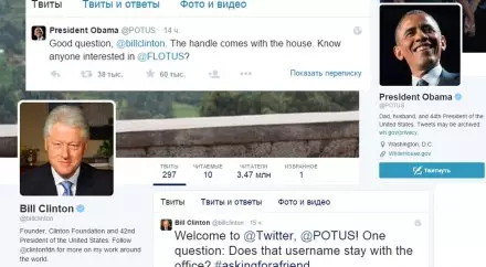 Билл Клинтон поприветствовал Барака Обаму как нового пользователя соцсети и спросил о том, останется ли аккаунт @POTUS (Президент США) в распоряжении Белого дома. Обама ответил, что вопрос Клинтона действительно хороший и пояснил, что аккаунт принадлежит хозяину Белого дома. Барак Обама также спросил, знает ли Клинтон кого-нибудь, кто заинтересован в аккаунте @FLOTUS (первая леди), который в настоящий момент ведет Мишель Обама.
