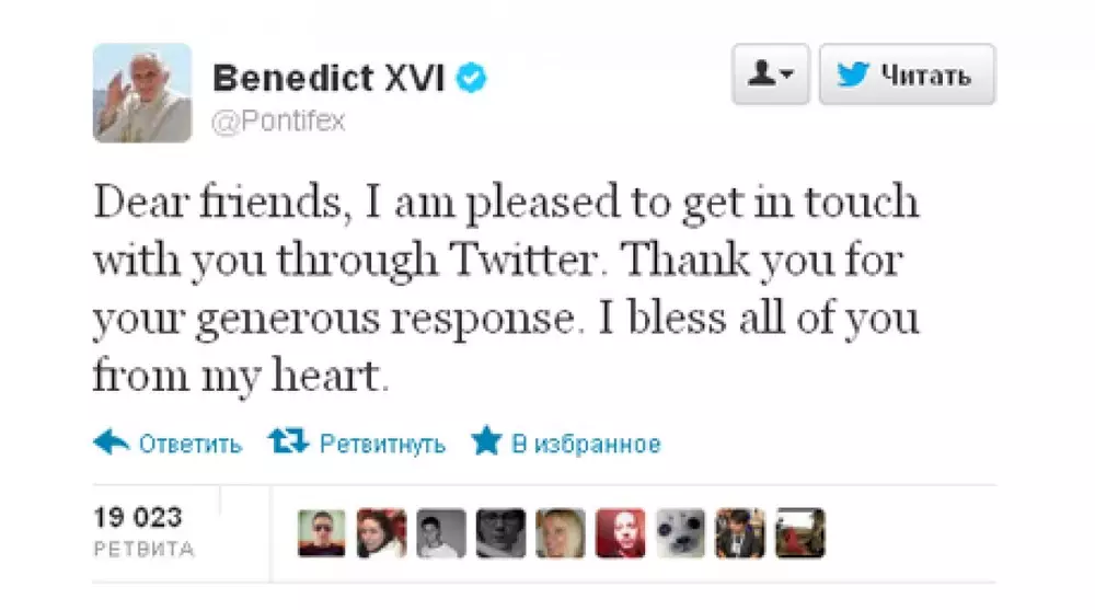 Многочисленные подписчики Twitter-аккаунта Папы Римского Бенедикта XVI дождались его первого сообщения, сообщает The Kerryman. Официальный аккаунт Папы Римского в Twitter появился 3 декабря. В своем первом сообщении Папа Римский поблагодарил своих подписчиков за их щедрые отклики, а также благословил их. Сейчас Twitter Папы Римского насчитывает более 720 тысяч подписчиков. С момента публикации первое сообщение понтифика ретвитнули более 25 тысяч раз. Помимо английской версии, аккаунт Папы Римского доступен на семи языках: итальянском, французском, испанском, немецком, португальском, польском и арабском. Напомним, что в июне 2011 года Папа Римский уже оставлял сообщение в Twitter, в котором говорилось о запуске официального информационного портала Ватикана News.va.
