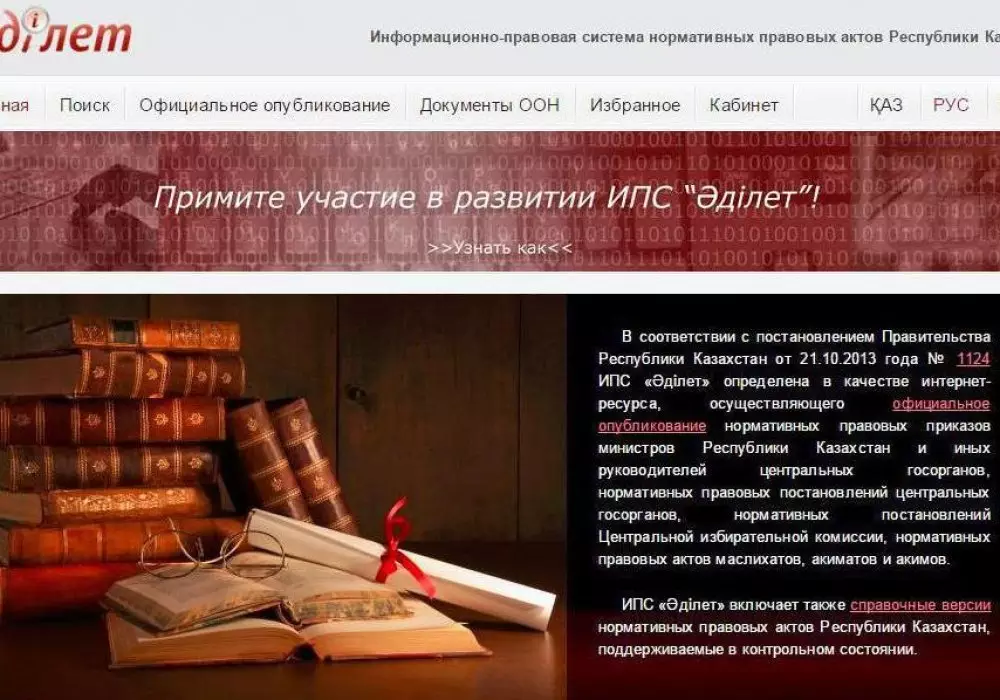 Напомним, что рубрика "Законы Казахстана" на нашем портале создана в сотрудничестве с РГП "Республиканский центр правовой информации" Министерства юстиции Республики Казахстан - авторами "Информационно-правовой системы нормативных правовых актов "Әділет". Целью спецпроекта является предоставление читателям бесплатного доступа к полной базе законов, кодексов, постановлений и других документов страны. База постоянно обновляется.