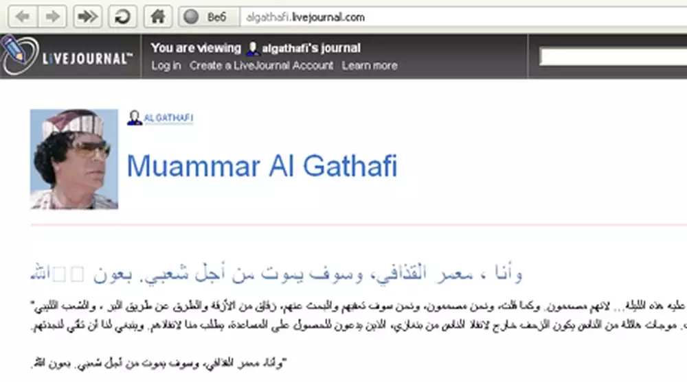 Ливийский лидер Муамар Каддафи решил призвать всех своих сторонников посредством Всемирной сети. Для размещения видеообращений и письменных посланий глава арабской Джамахирии завел свою персональную страницу на популярной блог-платформе LiveJournal.