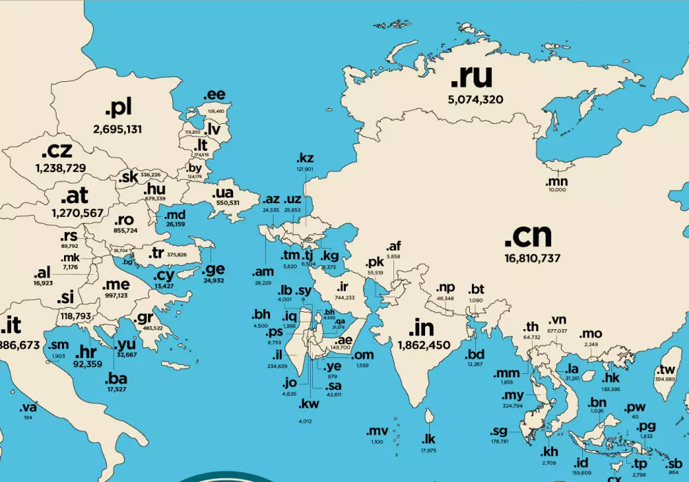 Отмечается, что самый популярный домен .com с 123 миллионами регистраций места на мировой карте не получил, поскольку он не принадлежит ни одной стране. Полную версию карты смотрите здесь.