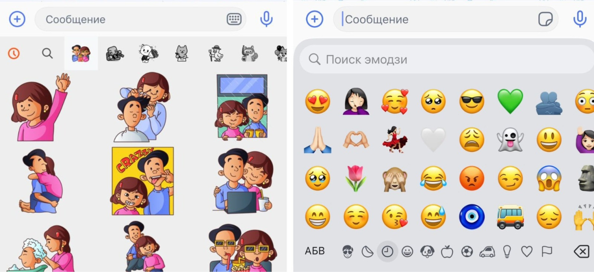 Интересно, что эмодзи в мессенджере практически не отличаются от тех, к которым пользователи уже привыкли в WhatsApp — визуально они почти идентичны. Существенных различий не заметно. Отличия прослеживаются разве что в наборе стикеров, которые представлены отдельной коллекцией внутри приложения.