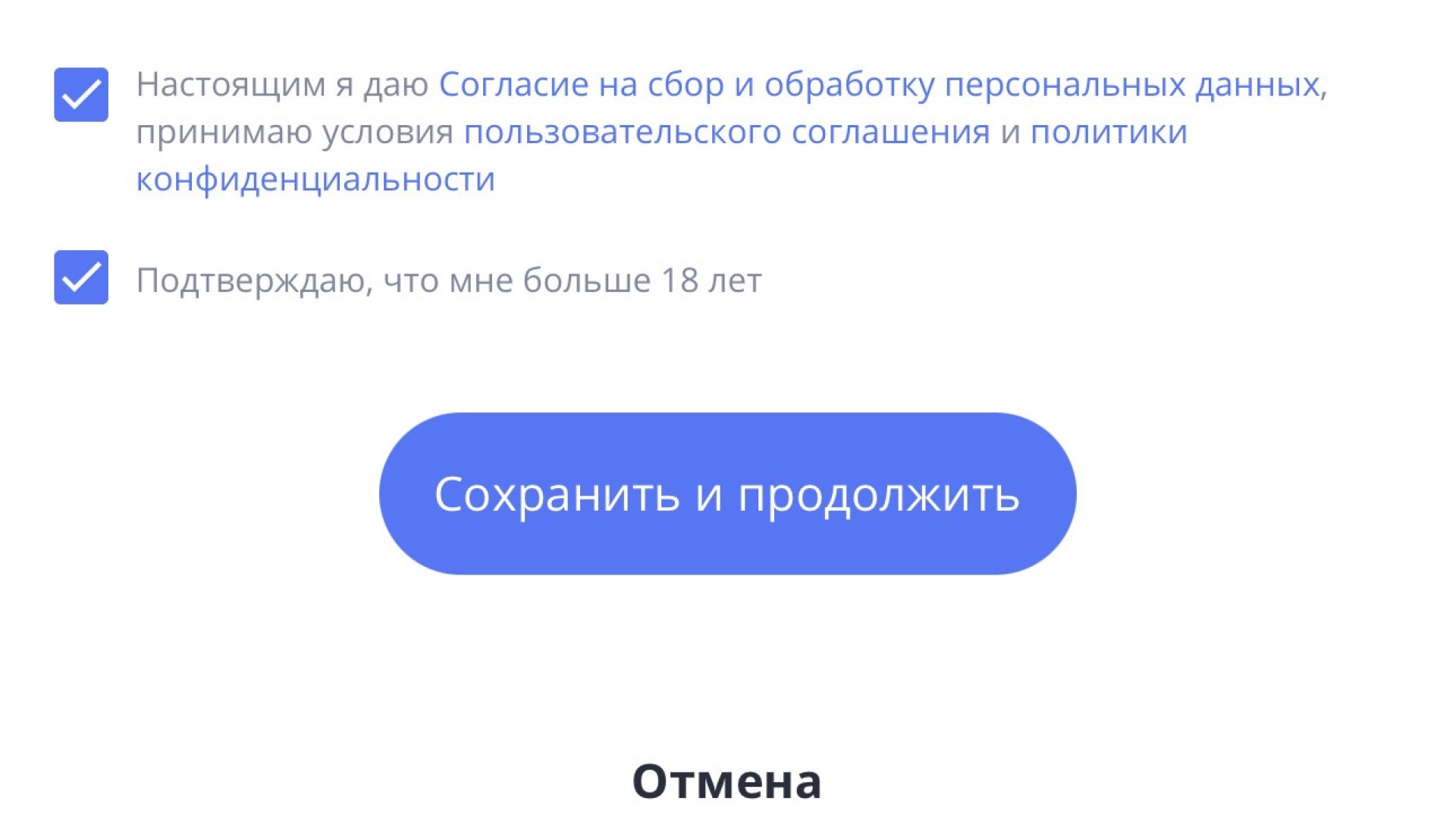Для регистрации необходимо указать ФИО и подтвердить согласие на сбор и обработку персональных данных. Что интересно, требуется также подтвердить, что пользователю исполнилось 18 лет — для этого предусмотрена отдельная галочка. Без её активации завершить регистрацию невозможно. При этом возраст отдельно не указывается, дата рождения также не запрашивается — подтверждение совершеннолетия происходит исключительно через отметку в соответствующем поле.