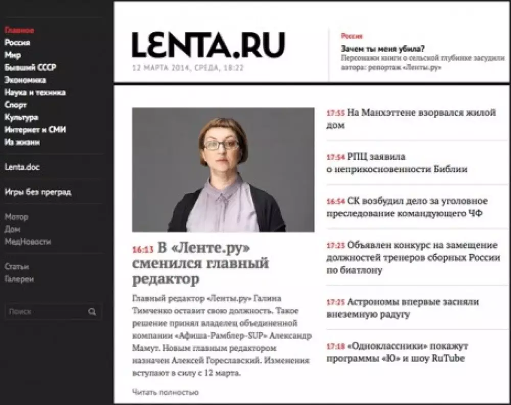Напомним, что главный редактор "Ленты.ру" Галина Тимченко была уволена владельцем объединенной компании "Афиша-Рамблер-SUP" Александром Мамутом. Новым главным редактором назначен Алексей Гореславский. Отметим, что Галина Тимченко, работавшая в "Ленте.ру" с момента основания в 1999 году, руководила изданием с 2004 года.