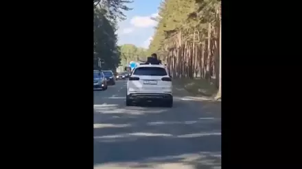 Видеорегистратор зафиксировал, как пассажирки впереди движущейся автомашины Chery Tiggo во время движения авто высунулись в открытый люк на крыше и делали селфи. Видео снято на территории курорта Бурабай.