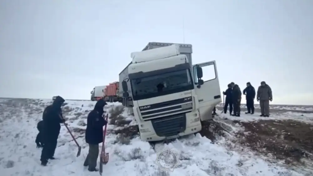По информации ведомства, речь идет об участке автодороги Жанаозен - Туркменистан. Обильный снегопад и непогода парализовали движение грузовых машин. Уточняется, что одна из фур съехала с дороги.
