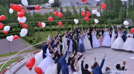 После вручения свидетельств о заключении брака молодые выстроились в фигуру в форме сердца и выпустили в небо воздушные шары. Вторая часть церемонии прошла уже в гостиничном комплексе "Думан", где среди молодоженов состоялся розыгрыш призов от столичного акимата - путевки в Турцию, Боровое и третий приз - бытовая техника.